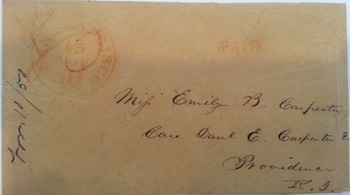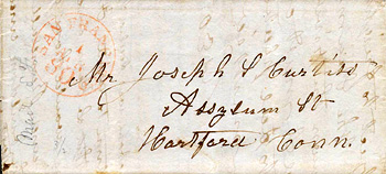 May 15 (likely 1851) to Connecticut - CDS with "blank" (no) rate and separate 40 rate handstamp, representing the unpaid transcontinental 40 cent single rate. Note the downward shift in location of Day/Month as the rate slug has been removed from the device. This CDS style and the 40 rate marking were in use both for May 1850 and 1851, so either year is possible. This cover is likely from 1851 as that was the sailing day for the contract steamer PMSS Northerner. The May 15, 1850 sailing date was the maiden voyage of the non-contract steamer Isthmus of George Law's Line. Although the PMSC had an exclusive government contract to carry the mails, George Law offered the SFPO postmaster the use of his ships to convey mail. Due in part to the demands of the public requesting more frequent mail departures, the postmaster authorized the line to carry mail only if the letter was specifically endorsed to the steamer. Since there is no endorsement of "Isthmus" on this cover it is assumed to be carried in 1851 (no endorsement was necessary for mails carried on the contract PMSC sailings).