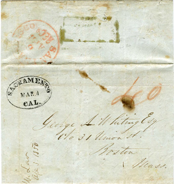 August 9 (1850) incoming to San Francisco - CDS with integral 2 rate, representing the local drop rate. Manuscript pr kindness of Mr Woodman. Letter datelined Mexico City, May 14th, and privately carried to San Francisco where it was deposited into the PO. This CDS with integral "2" rate is somewhat scarce and surviving evidence shows it to be used only in the last half of 1850. Letter discusses copper mining in Mexico.