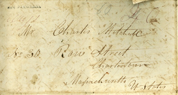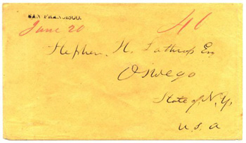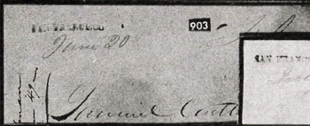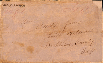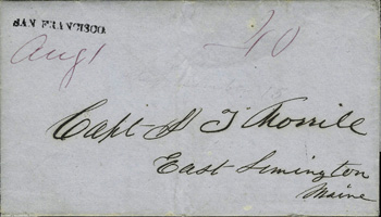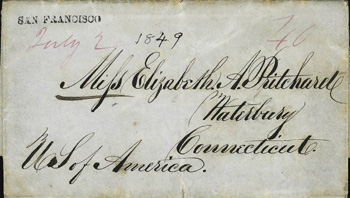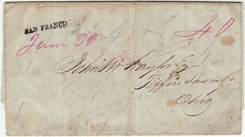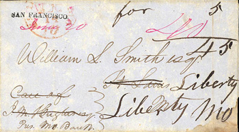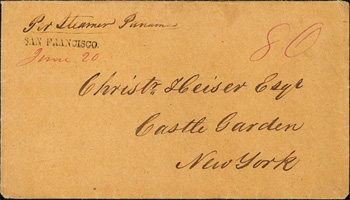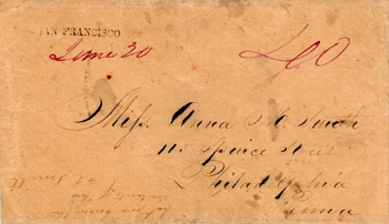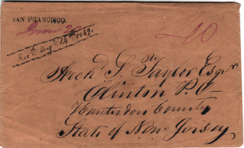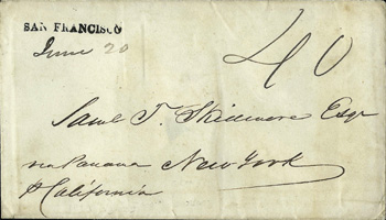 June 20 (1849) to New York, First-day use of the SF straightline marking with associated manuscript date and rate, an unpaid transcontinental 40 cent single rate letter. Cover endorsement via Panama p California with letter datelined April 30, 1849. The PMSS California actually departed May 1 (see this cover). The steamer which actually left on June 20 was the PMSS Panama. The sender intended to catch the departure of the California but the letter was apparently too late (and because of this the cover received the straightline marking instead of the manuscript marking). The next opportunity for contract mail sailing was seven weeks later on June 20. This is the earliest found cover from the SFPO with a specific steamer name on it.